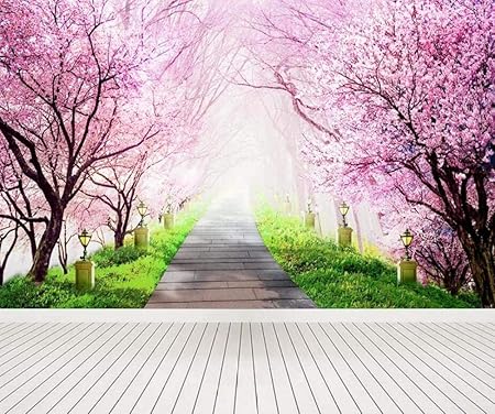 Wallpaper 3d Mural Romantic Pink Cherry Blossom Forest Stone Road